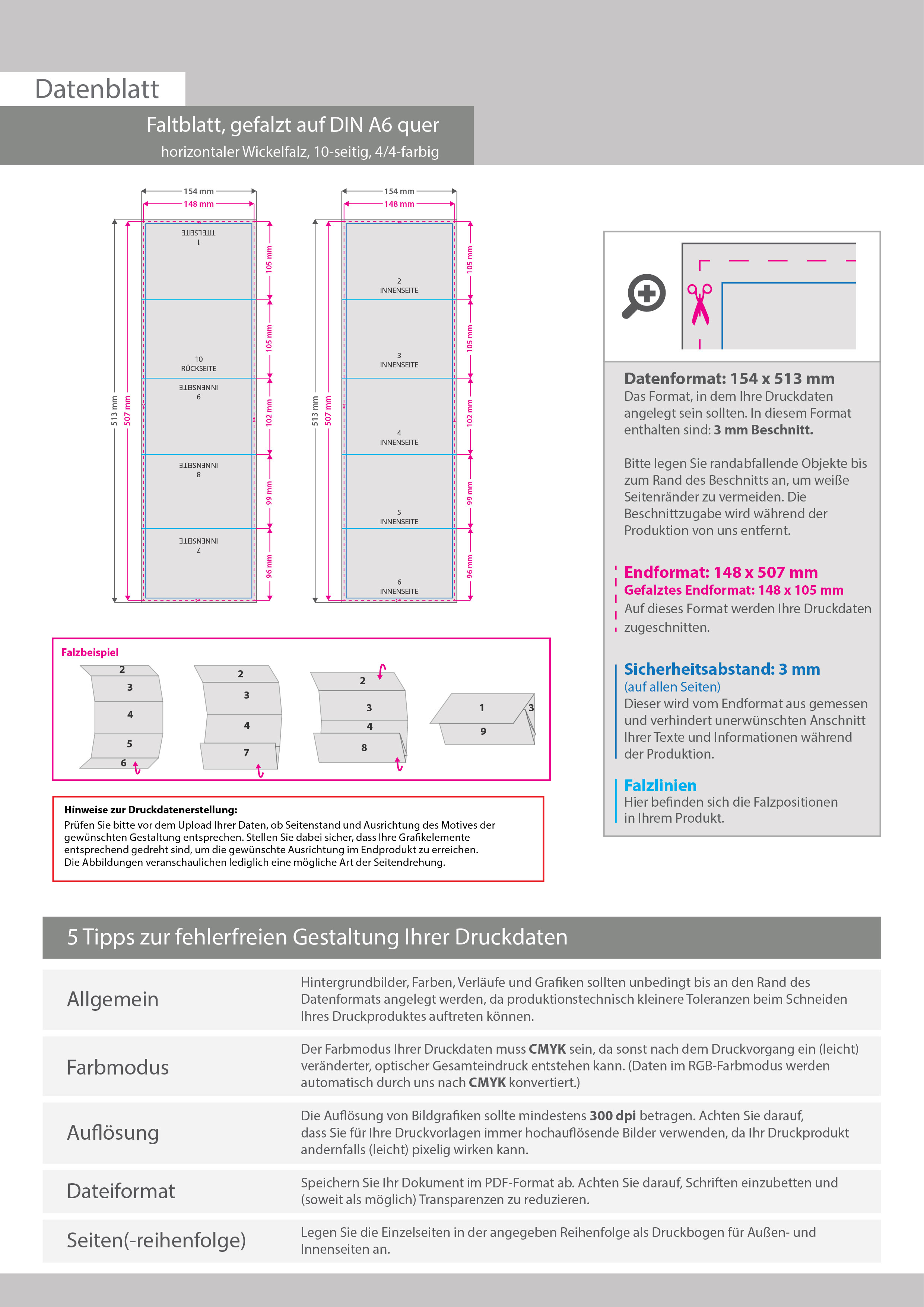 Faltblatt, gefalzt auf DIN A6 quer, horizontaler Wickelfalz, 10-seitig
